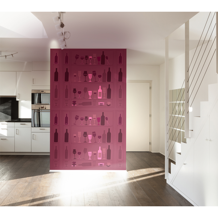 Silhouettes of wine glasses in multiple variations of purple and burgundy. A graphic and contemporary panoramic wallpaper. It's the little touch of fluorescent pink that makes the difference!