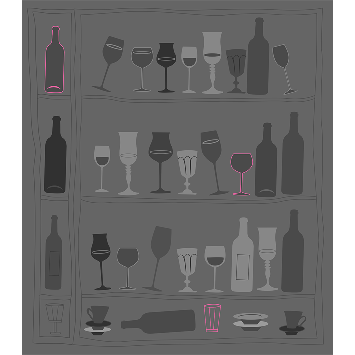 Silhouettes of wine glasses in multiple variations of grey. A graphic and contemporary panoramic wallpaper. It's the little touch of fluorescent pink that makes the difference!