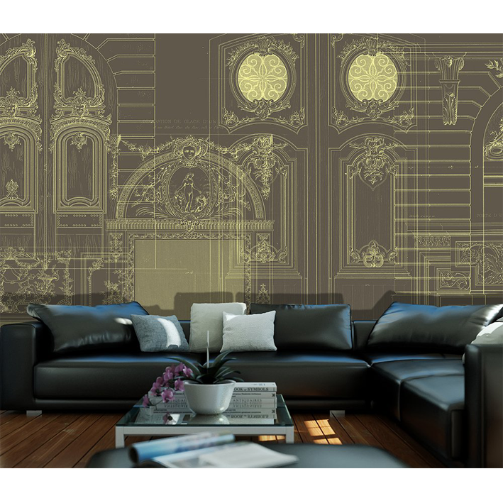 This wallpaper features architectural drawings of Baroque doors, bringing a touch of majesty and opulence to any space. By recreating the magnificent details of Baroque doors, from their carved decorations to their ornamental moldings, it gives the room a theatrical and elegant atmosphere. Whether for a majestic entrance, a refined living room or a historic venue, this wallpaper transforms the space into a true work of architectural art.