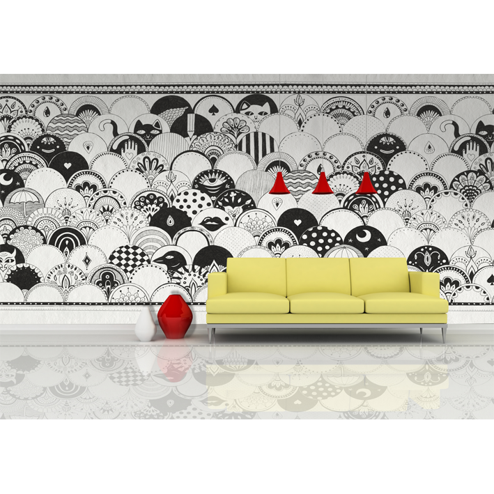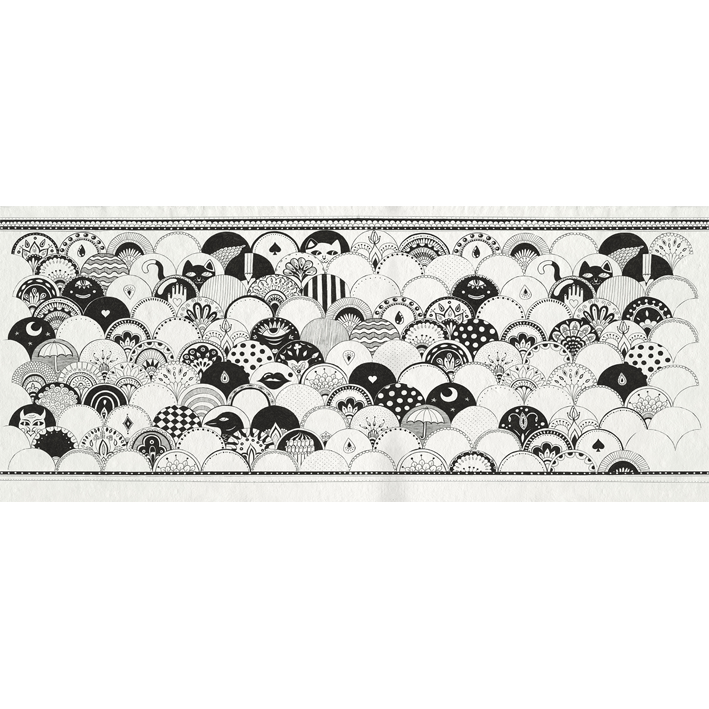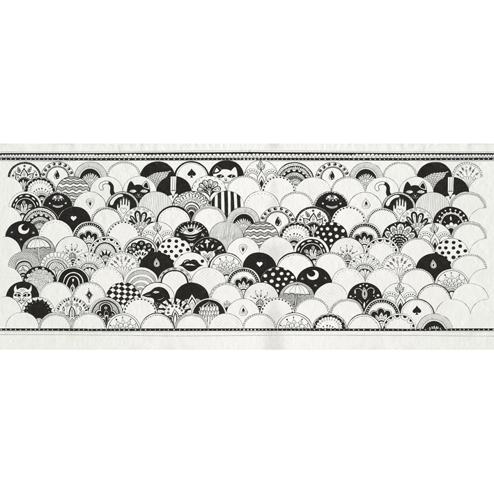 Mandala-inspired, fish scales, japanese graphic design... We have fun looking for the cat or the bird, hidden in volutes drawn on white paper, in this panoramic wallpaper, so restful.
