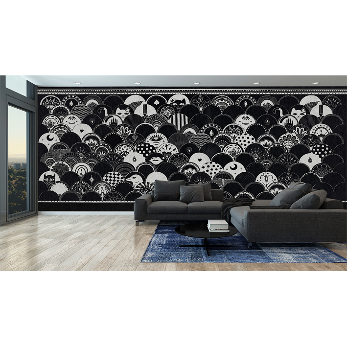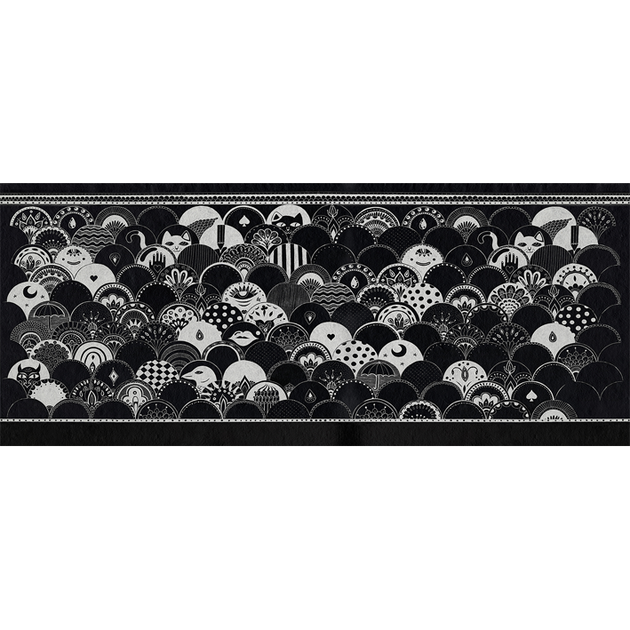 Mandala-inspired, fish scales, japanese graphic design... We have fun looking for the cat or the bird, hidden in the volutes of this panoramic white wallpaper on a black background, so restful.