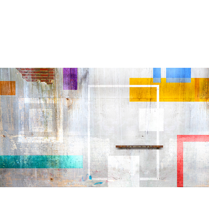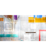 On a plastered wall that has lived, the tagger has painted neat and neat geometric shapes: cobalt, golden yellow, purple, turquoise, bright red, white. Trend exhibition for this panoramic wallpaper.