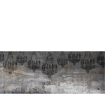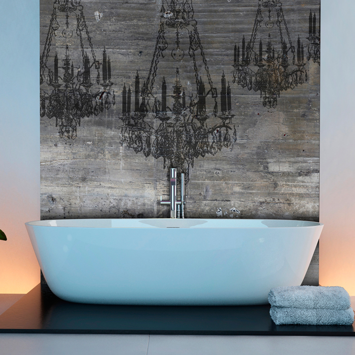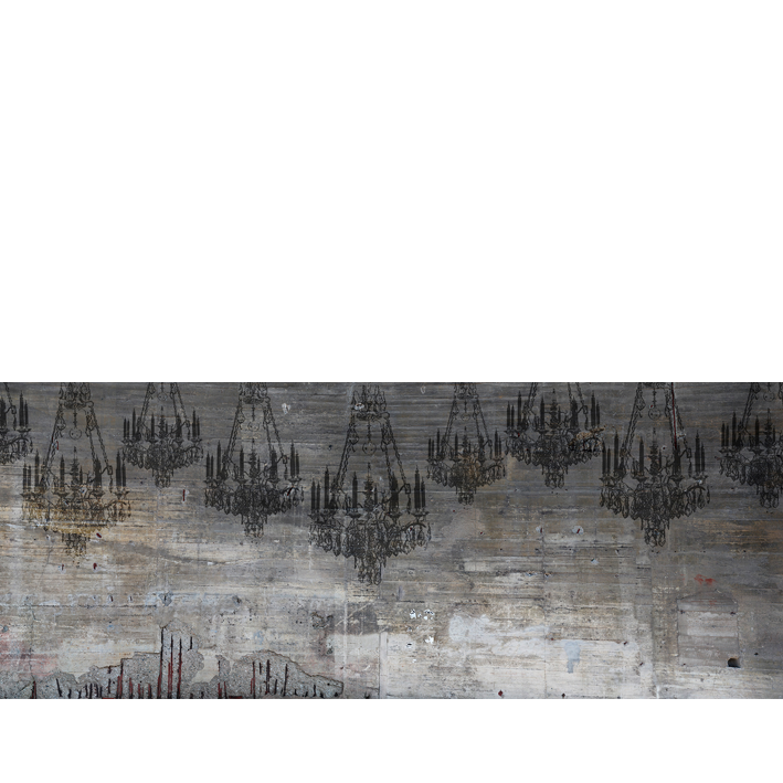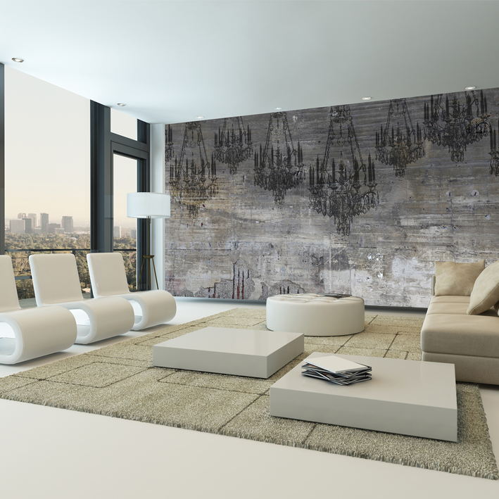 Shadows of sophisticated, century-old crystal chandeliers etched into the raw concrete. A successful marriage of opposites for this amazing panoramic wallpaper. On request the position and color of the chandeliers can be modified. Here they are inlaid on a concrete background but, if you wish, they can be on other materials, stone, brick, paper, fabric, wood....