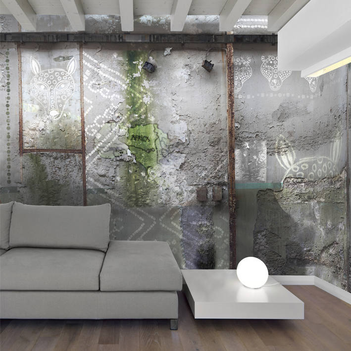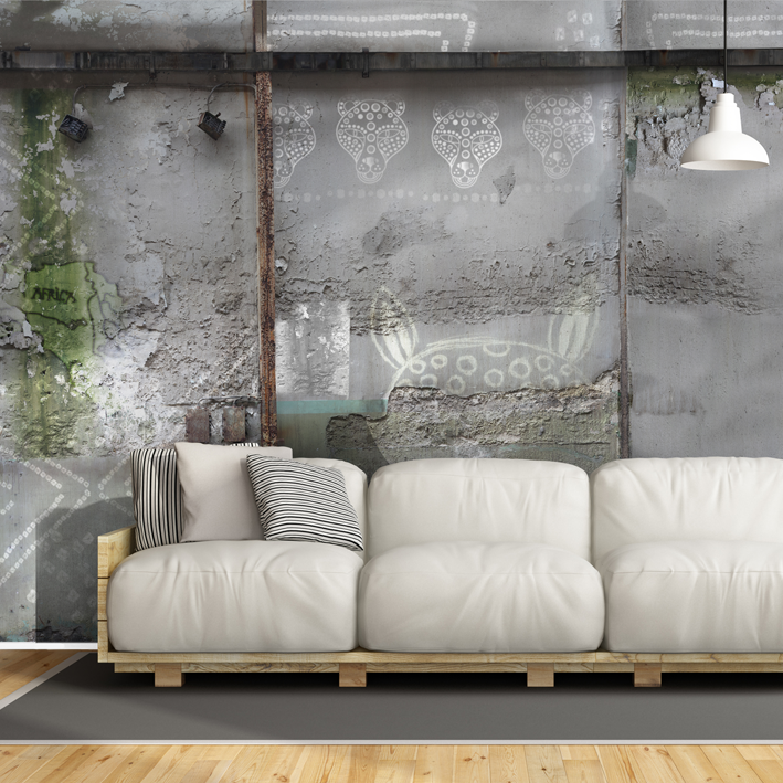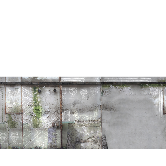Same wall as BM110. Other chalk patterns on weathered wall, splashed with rain, soft green moss jets, cement drips. Time has made the artist for this moving panoramic wallpaper.