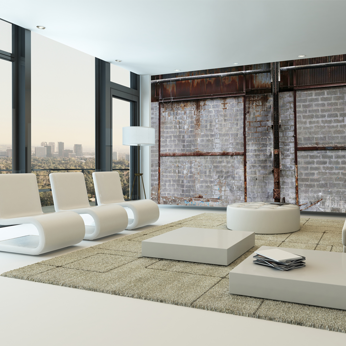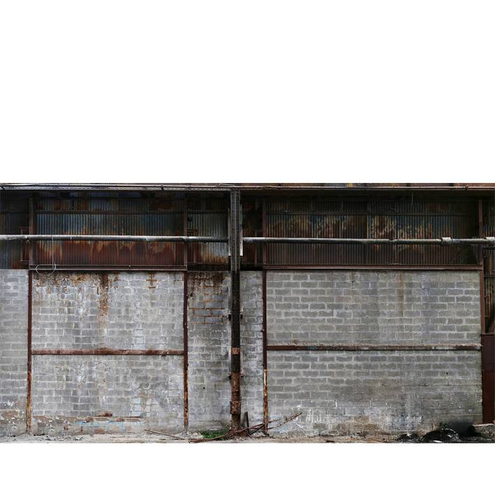 Panoramic wallpaper to be installed in a minimalist room bathed in light for a striking contrast! Mixture of rusty sheet metal and concrete bricks for this hangar wall, photographed in an abandoned industrial area. Very trendy!