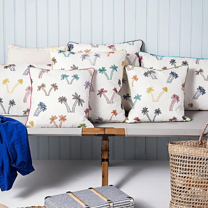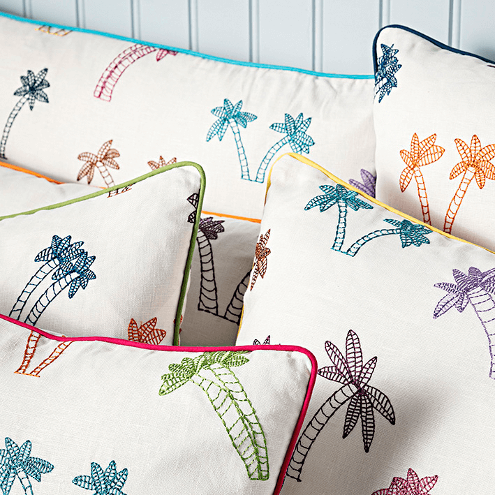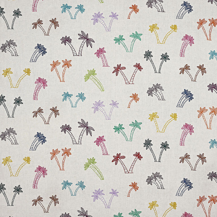 These embroidered and colored palm trees dance, follow a movement with a light breeze that takes us to a paradise island of course! Drawing made by Andréa 6 years old. Coordinated with wallpaper FP814 LES PALMIERS D'ANDREA. 10% of the profits are donated to the Fondation de France, to support the project Tous unis contre le virus (All united against the virus) via an action carried out to prevent school dropouts.