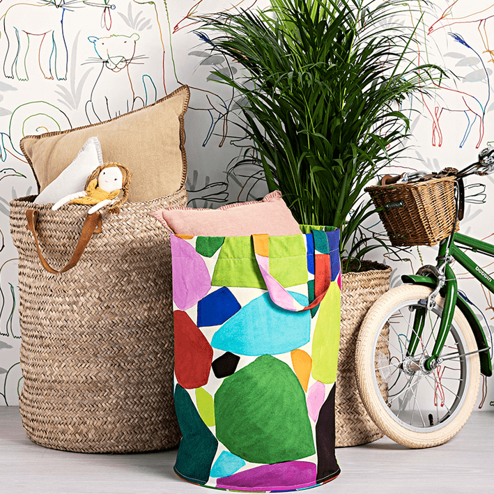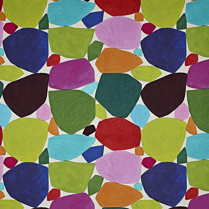 Multicolored cut-out shapes: the interpretations are varied! Colored pebbles, a shower of confetti or an imaginary giraffe skin... Let your imagination run wild! Colored drawing with ink and printed on cotton. Coordinated with wallpaper FP837 CARNAVAL. 10% of the profits are donated to the Fondation de France, to support the project Tous unis contre le virus (All united against the virus) via an action carried out to prevent school dropouts.
