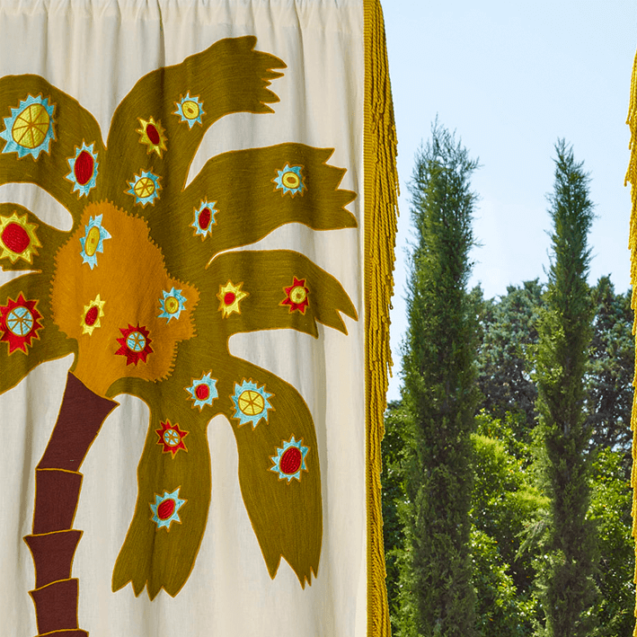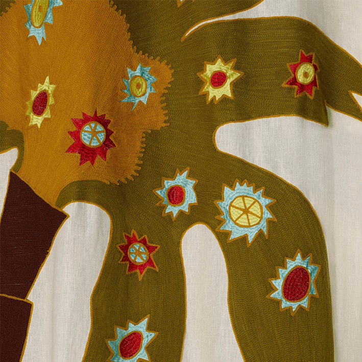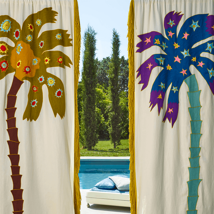 As in a dream, this majestic palm tree blooms with stars is decorated with the most delicate embroidery. This panel, entirely embroidered on linen, is 3 meters high and forms a pair with reference F3564 LES PALMES D'ALMA II (01 NUIT - DROITE). Drawing made by Alma, 11 years old. 10% of the profits are donated to the Fondation de France, to support the project Tous unis contre le virus (All united against the virus) via an action carried out to prevent school dropouts.