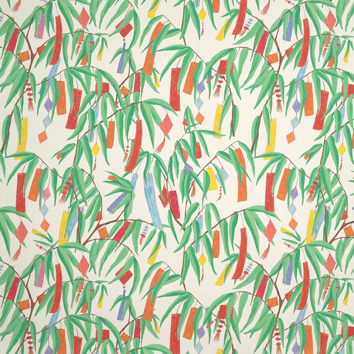 다채로운 색감을 자랑하는 리본으로 뒤덮인 대나무를 담은 일러스트레이션에서 일본 타나바타 축제 여름날의 즐거움이 느껴집니다. 넓은 폭의 매트한 non-woven 배킹에 프린트되었습니다.