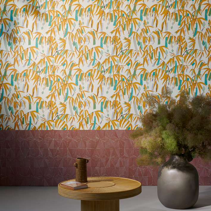 다채로운 색감을 자랑하는 리본으로 뒤덮인 대나무를 담은 일러스트레이션에서 일본 타나바타 축제 여름날의 즐거움이 느껴집니다. 넓은 폭의 매트한 non-woven 배킹에 프린트되었습니다.