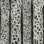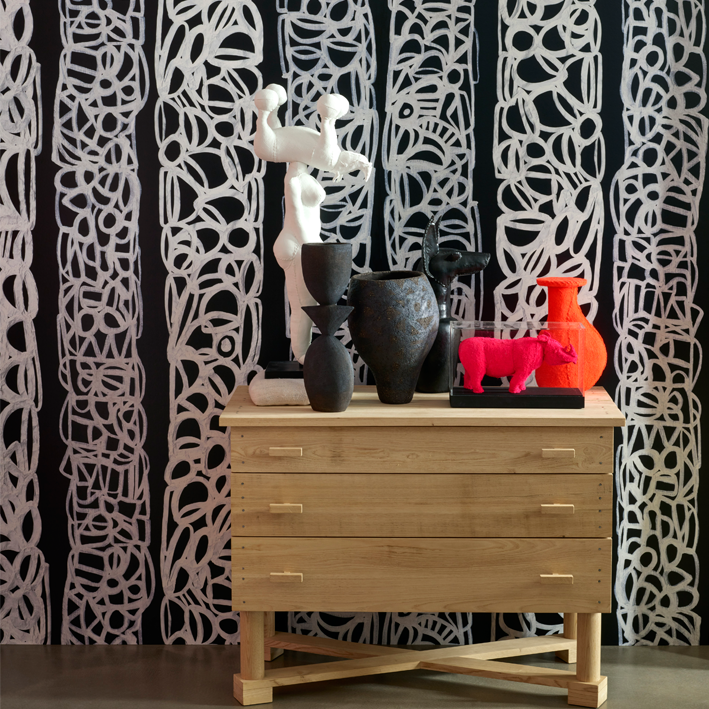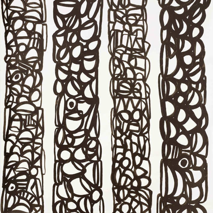 Totem is a sort of manifesto where the pictorial language of Christian Astuguevieille takes on full meaning. The artist developed what he calls an “imaginary writing” and has continued to make it evolve. He mixes figurative elements representing symbols of civilization—objects, amphorae, shields—with a more abstract graphic style. He extends this writing on rolls of tracing paper in a vertical composition using India ink and a thick brush.