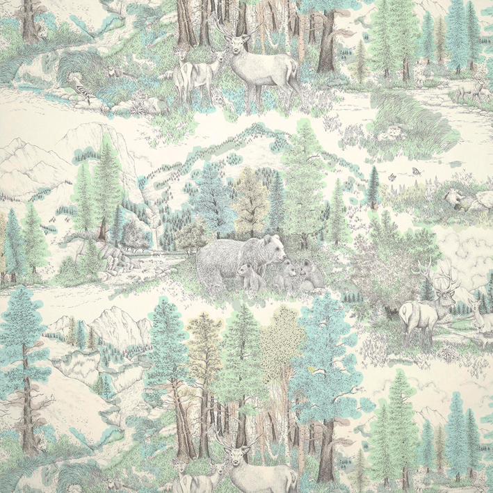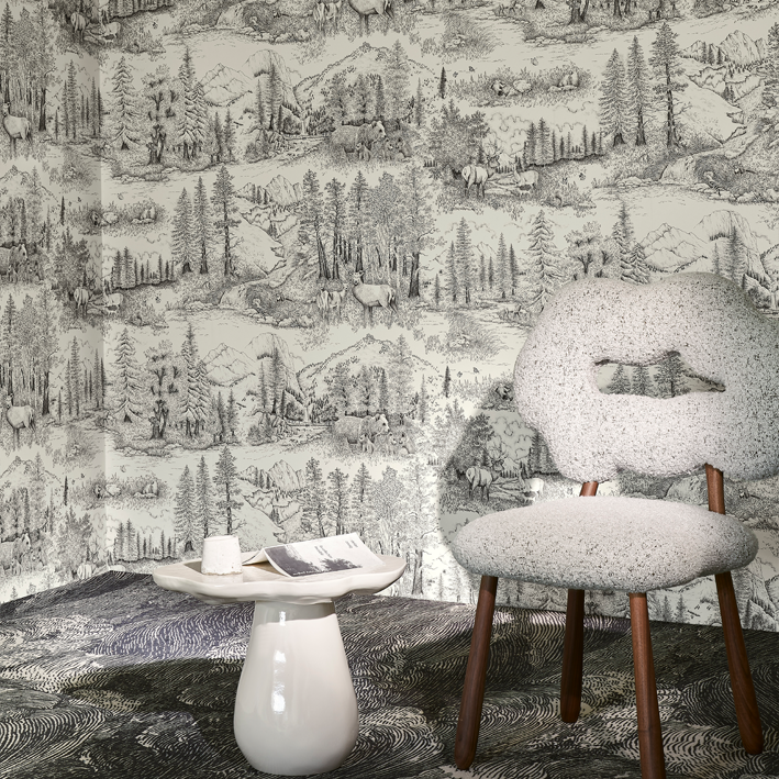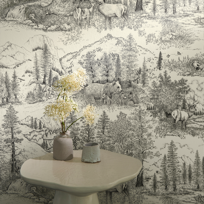 웅장한 숲과 산을 손수 담은 장면에 카리부와 곰 그리고 마멋들이 등장합니다. 블랙 또는 컬러 버젼으로 만나볼 수 있습니다. 컬러가 이 목탄화에 컨템포러리한 느낌을 더합니다. 넓은 폭의 매트한 non-woven 배킹에 프린트되었습니다.