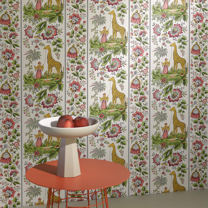 ISMAELIA reproduces a canvas printed around 1830, entitled "La girafe", kept at the Musée de l'impression sur Etoffes in Mulhouse. The animal intended for Charles X, unloaded in Marseille in 1826, crossed France to reach the menagerie of plants in Paris. This extraordinary event gave birth to the "giraffomania" in the decorative arts.