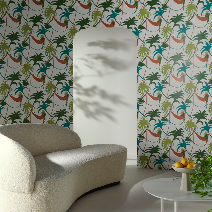 Maison Pierre Frey 아카이브에서 발굴한 1930년대 드로잉에서 프랑스 남부 코코넛 나무 아래 드리운 평화로운 낮잠의 순간을 만끽해봅니다. 넓은 폭의 매트한 non-woven 배킹에 프린트되었습니다.