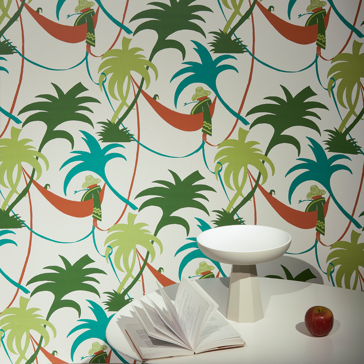 Drawing from the archives of the Maison Pierre Frey dating from the 1930s illustrating the peaceful moment of the siesta under the coconut trees in the south of France. Printed on a wide width matte non-woven backing