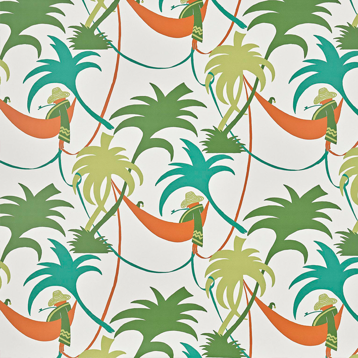 Drawing from the archives of the Maison Pierre Frey dating from the 1930s illustrating the peaceful moment of the siesta under the coconut trees in the south of France. Printed on a wide width matte non-woven backing