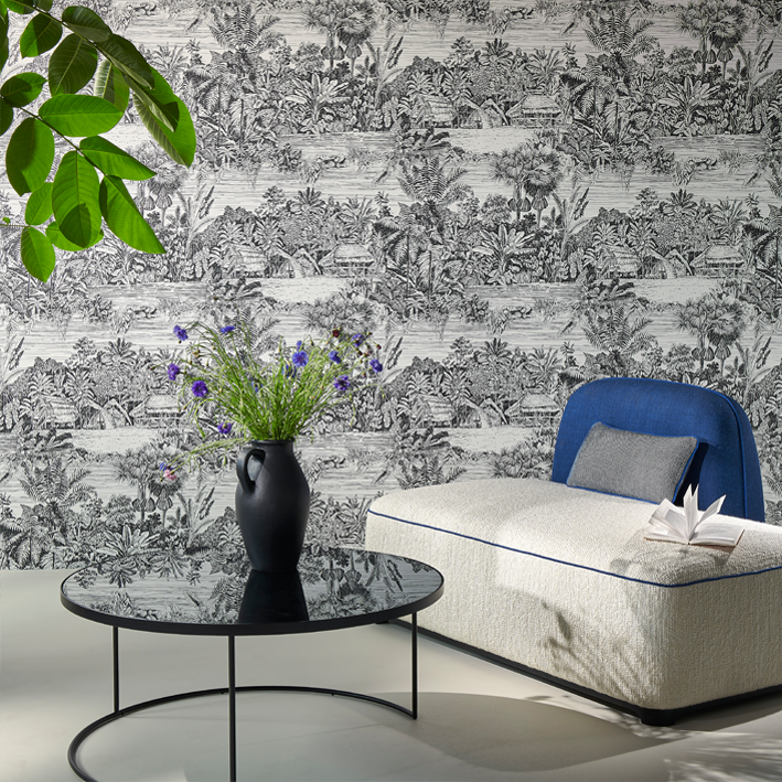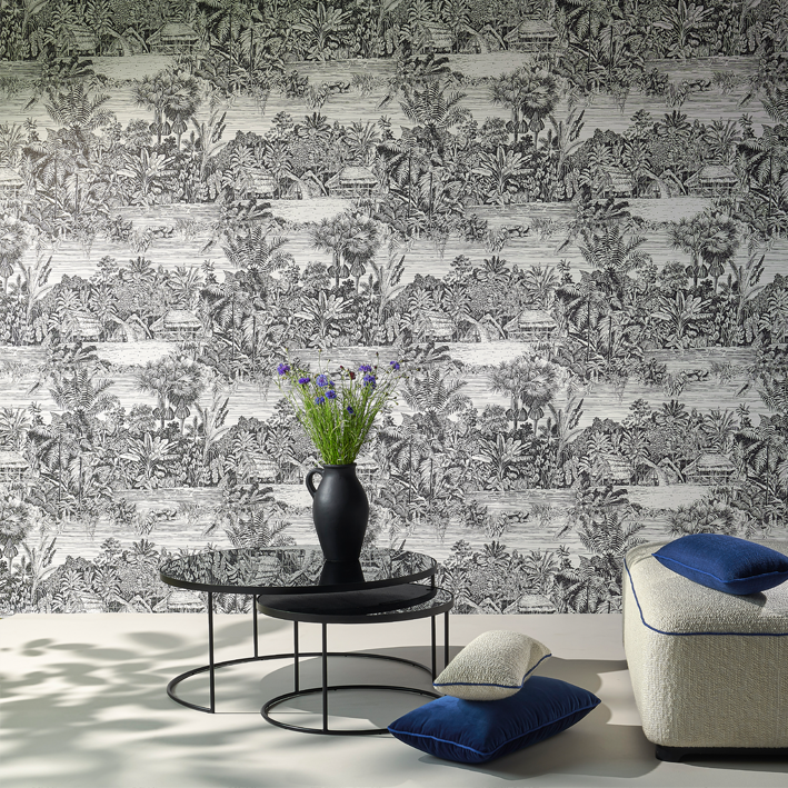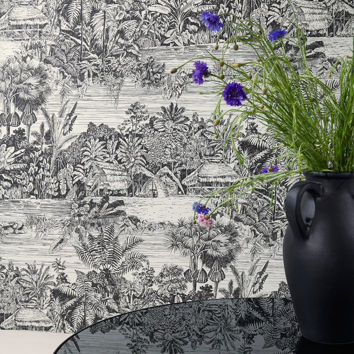 바로 그 자리에서 연필로 스케치한 듯한 드로잉이 카리브 해의 꿈과 같이 아름다운 나라 벨리즈에서 자라나는 열대우림 사이 강가로 우리를 이끕니다. 넓은 폭의 글레이즈드 non-woven 배킹에 프린트되었습니다.