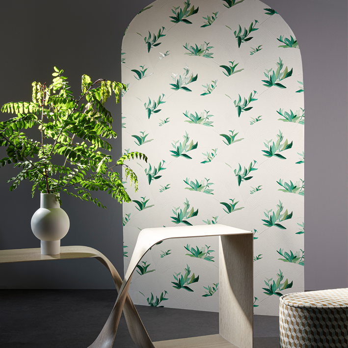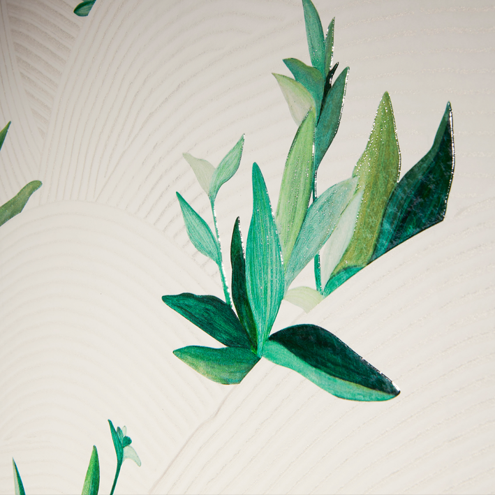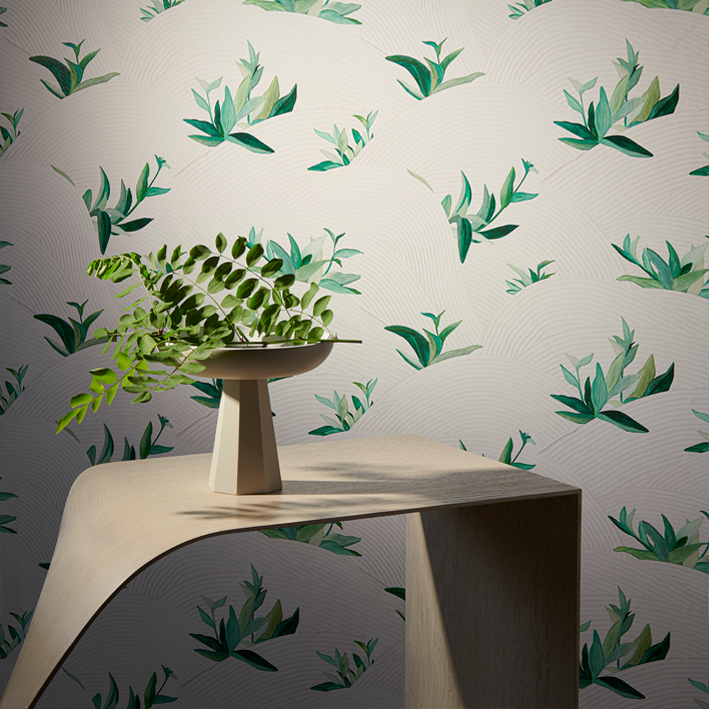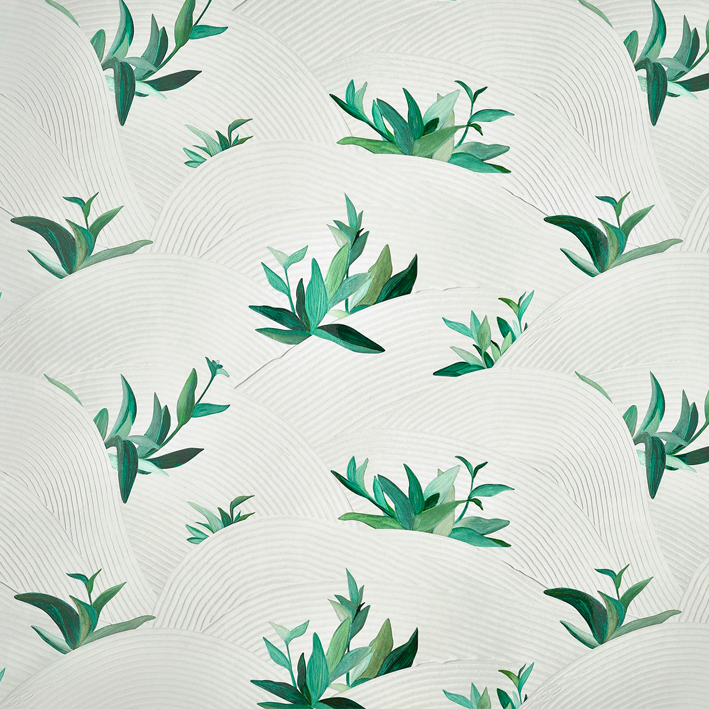 Contemporary wallpaper inspired by the salt desert of Salinas Grandes in Argentina where salt and agaves meet. The 3D printing as a lacquer in relief underlines the plants in a new way. 3D printing on wide width non-woven backing.