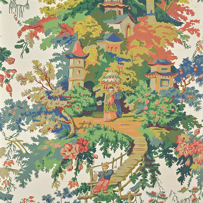 Reproduction of a 19th century gouache from the archives of Pierre Frey illustrating the composition and elegance of Japanese gardens. Printed on a raffia background laminated on non-woven backing.