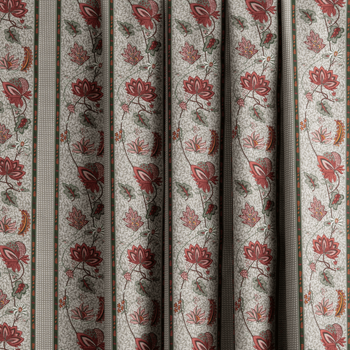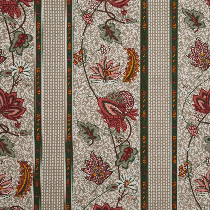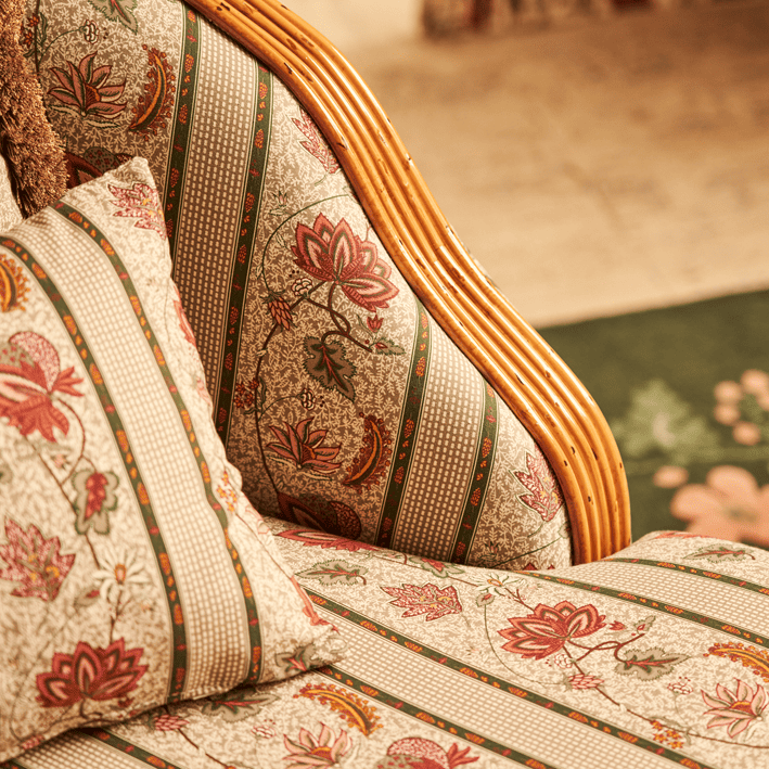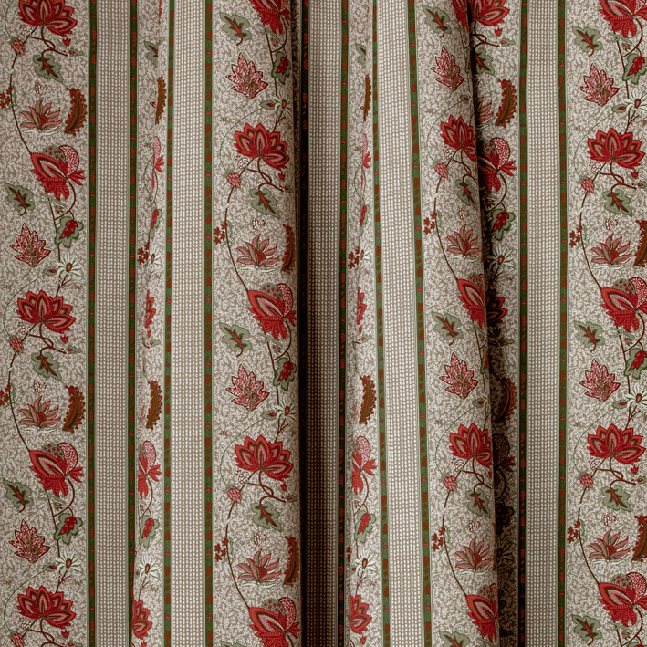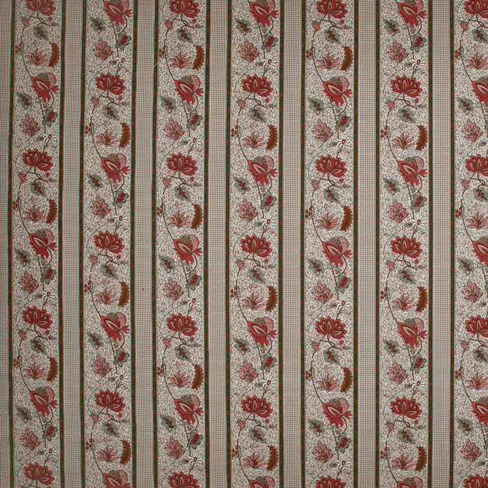 Our AUGUSTINE fabric is a stripe adaptation of the ÉGLANTINE fabric (4266): a Quenin archive, in the spirit of a floral indienne. Redesigned to retain the hand-printed effect of the archive with all the irregularities of the drawing lines, this floral indienne is woven and printed in France on a 100% cotton canvas.
