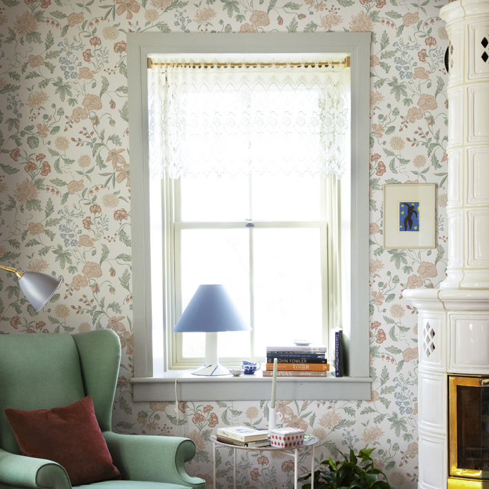 This design is part of the collection inspired by Carl and Karin Larsson, an iconic and beloved Swedish design family active in the 19th century. The design duo still inspires the whole world with their artistry, their home and their way of living. This hand-painted design adds beauty to your home. This design gives you the possibility to create both intense coziness and an airy feeling to a bedroom. This delicate and decorative wallpaper gives a sense of enlarging a space and an airy feeling of being outdoors during the lovely Swedish summer. The creative couple Karin & Carl Larsson loved to surprise and show appreciation for each other through creative expressions. The wallpaper “Till Karin”, is a new chapter of the original wall painting located above Karin’s bedroom door in their inspiring home, Lilla Hyttnäs. This painting was a gift and a declaration of love to Karin from Carl Larsson in 1894 representing flowers from their beautiful garden. Carl and Karin Larsson often painted decorative murals directly on the walls also involving their four children in the process. The name of the wall mural is shared with their daughter Suzanne, who co-created a flowery border in her own room at their iconic home.