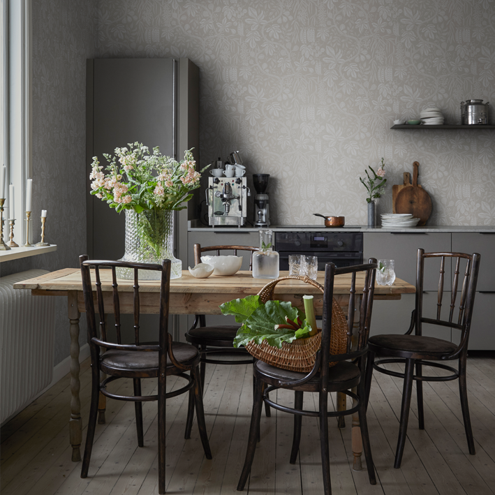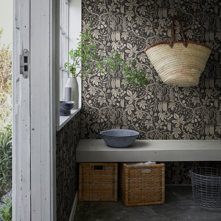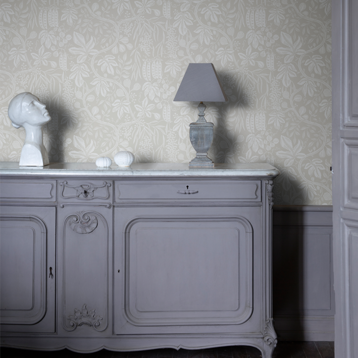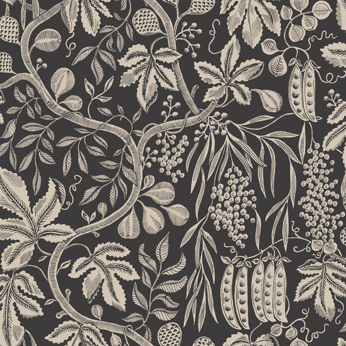 If you were to enter the chateau’s kitchen in late summer, you’d be met with the heavenly aroma of confiture de figues, bubbling away in copper pots on the stove. As sunshine bathes the orchard, a bounty of violet-blushed figs grow fat and sweet, destined for the pot or simply eaten straight from the tree they’re a family favorite. This design captures the delights of the potager and orchard: figs, grapes and peas united in a tribute to the abundance of the seasons. This Fig Garden wallpaper has the colorway charcoal.