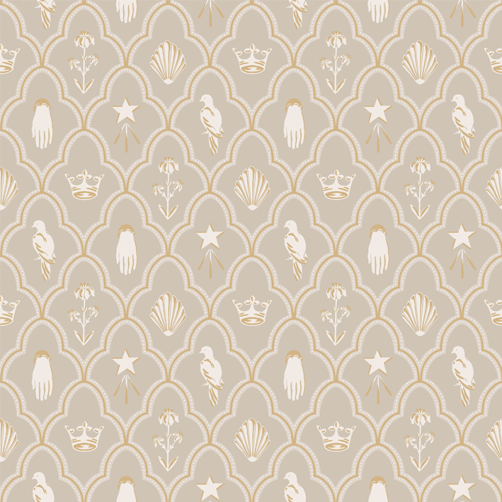 Full of symbolic references to the Bearn: a crown to commemorate the birthplace of a Swedish king as well as a French King, Edelweiss, a flower synonymous with Spring in the Pyrenees and a symbol of purity and innocence, the hand so often seen as a brass knocker on the doors of Béarnaise houses and a Turtledove, the namesake of the chateau’s barn La Grange aux Tourterelles, almost never without at least one to adorn its roof. This Turtledove barn wallpaper has the colorway grey.